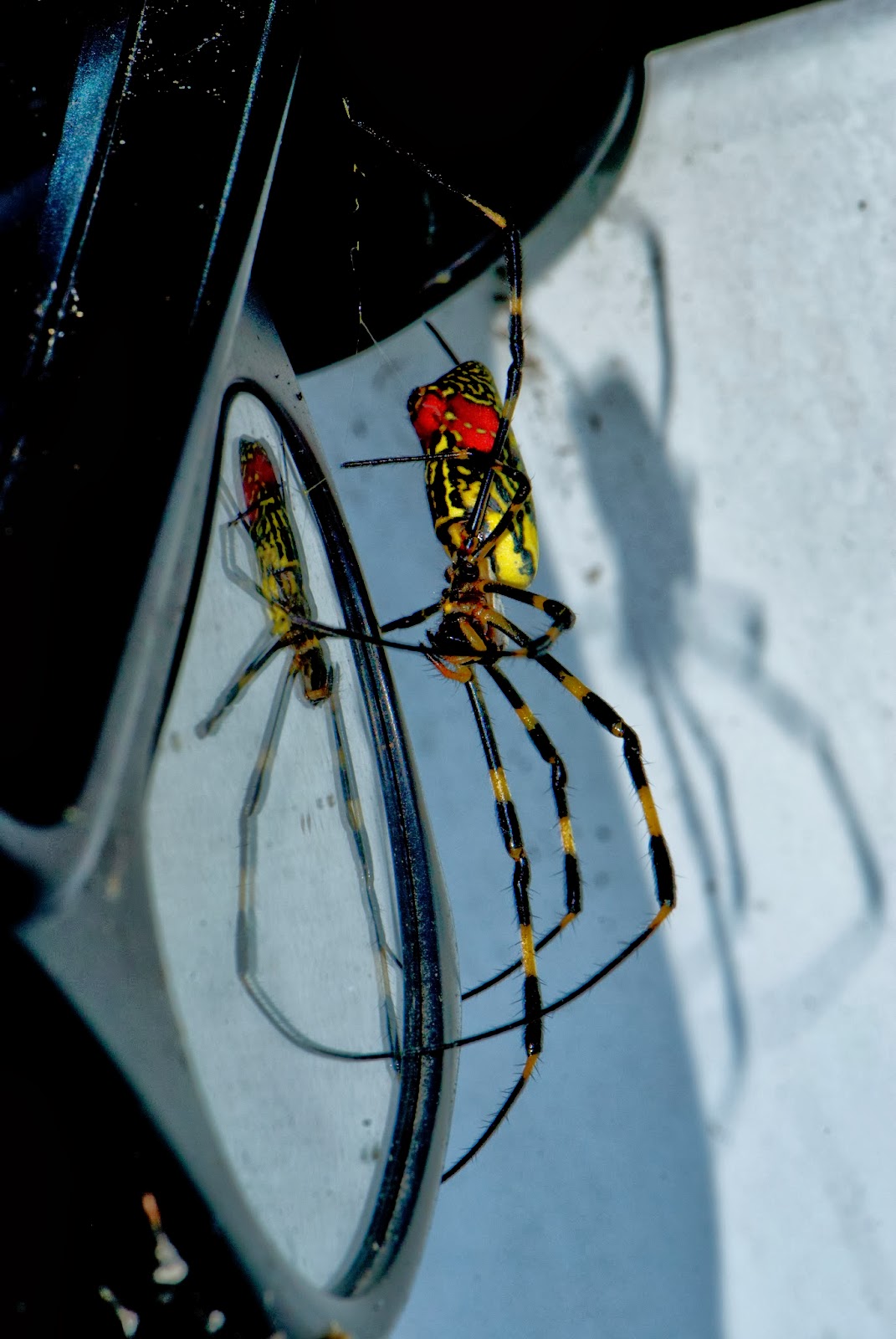 写真では分かりにくいが、メスが餌を食べていたら、しばらくしてオスが餌を食べにきた。 ハチの上の方にオスの細い足が数本見えている。 一つ間違えばそのままメスに食べられそうだ。 |