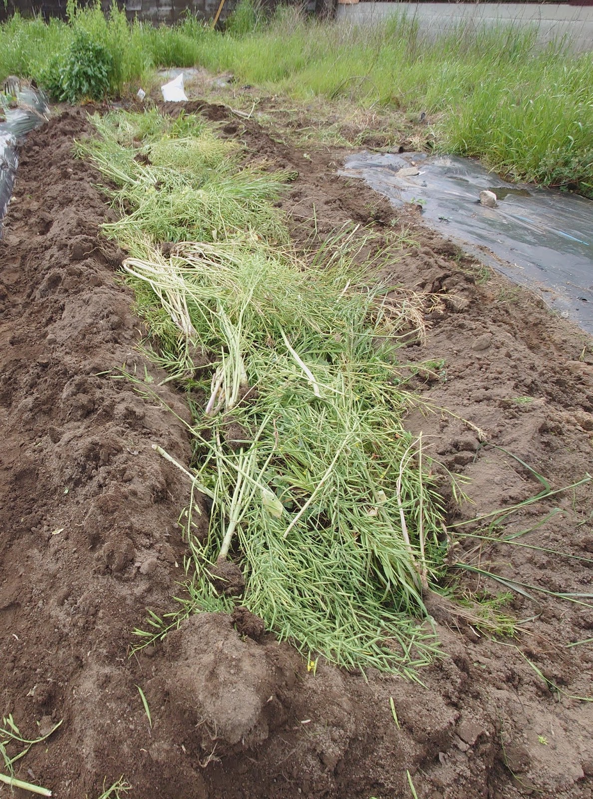 いつものように畝予定地に溝を掘って、収穫の終わった冬野菜や雑草を中に敷き込んだ。