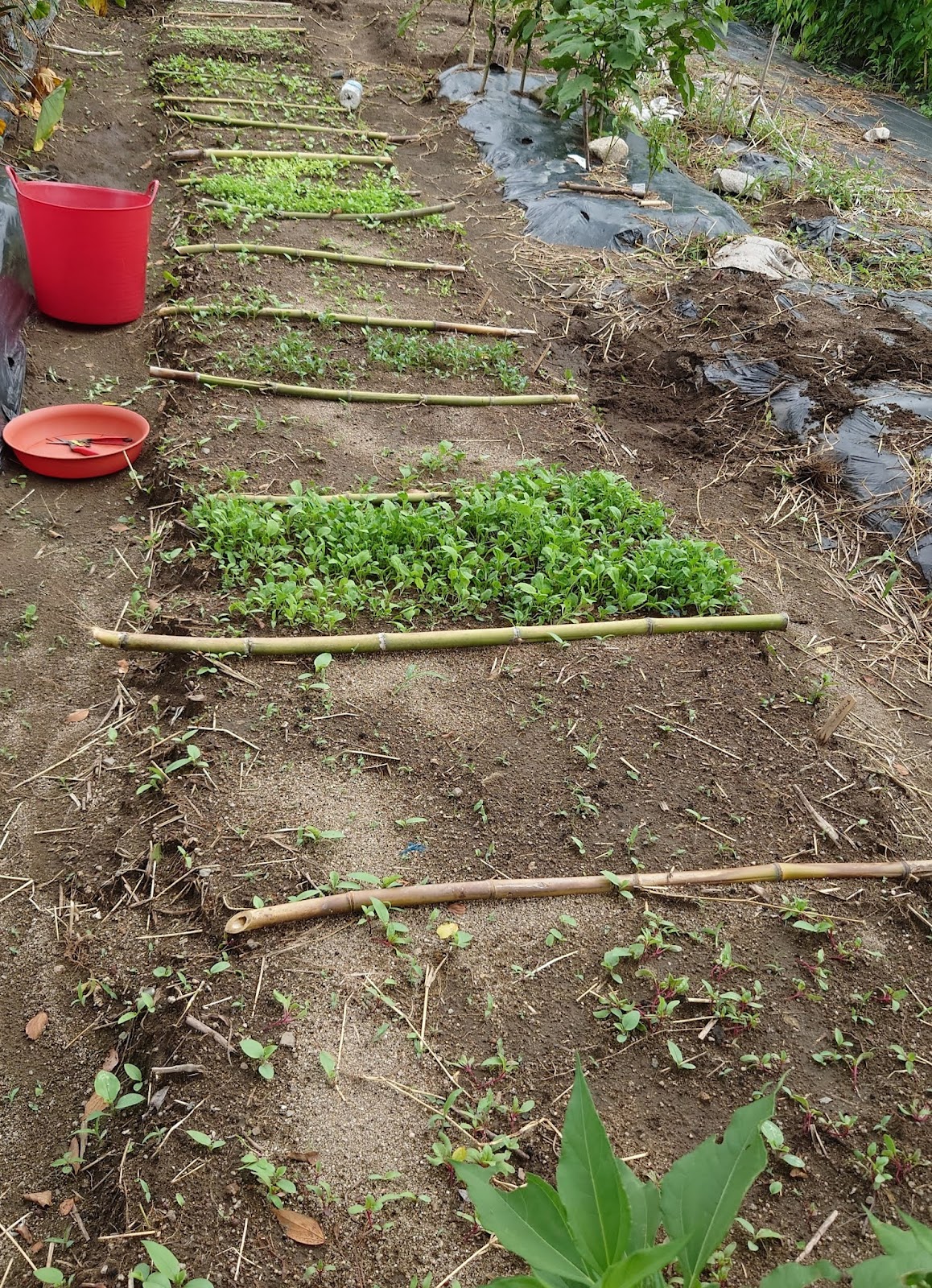 その後雨は小康状態になり、雨上がりの昼休みに畑に行ってみると、雨のお陰か先日蒔いた種から多くの芽が出ていた。