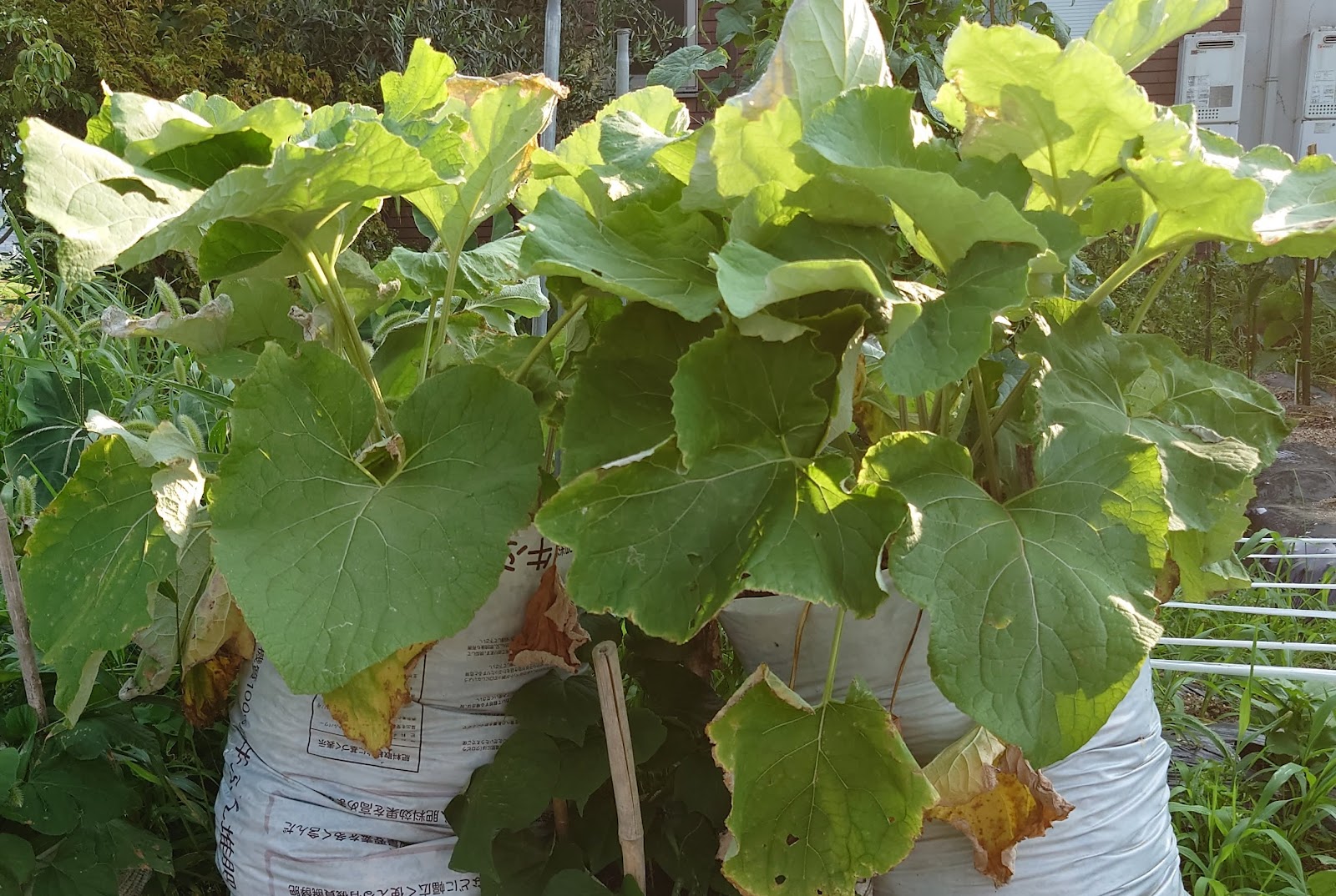 さて、こんな天気の中でも第1菜園で水やりが出来るところに育っている袋栽培のゴボウは元気。