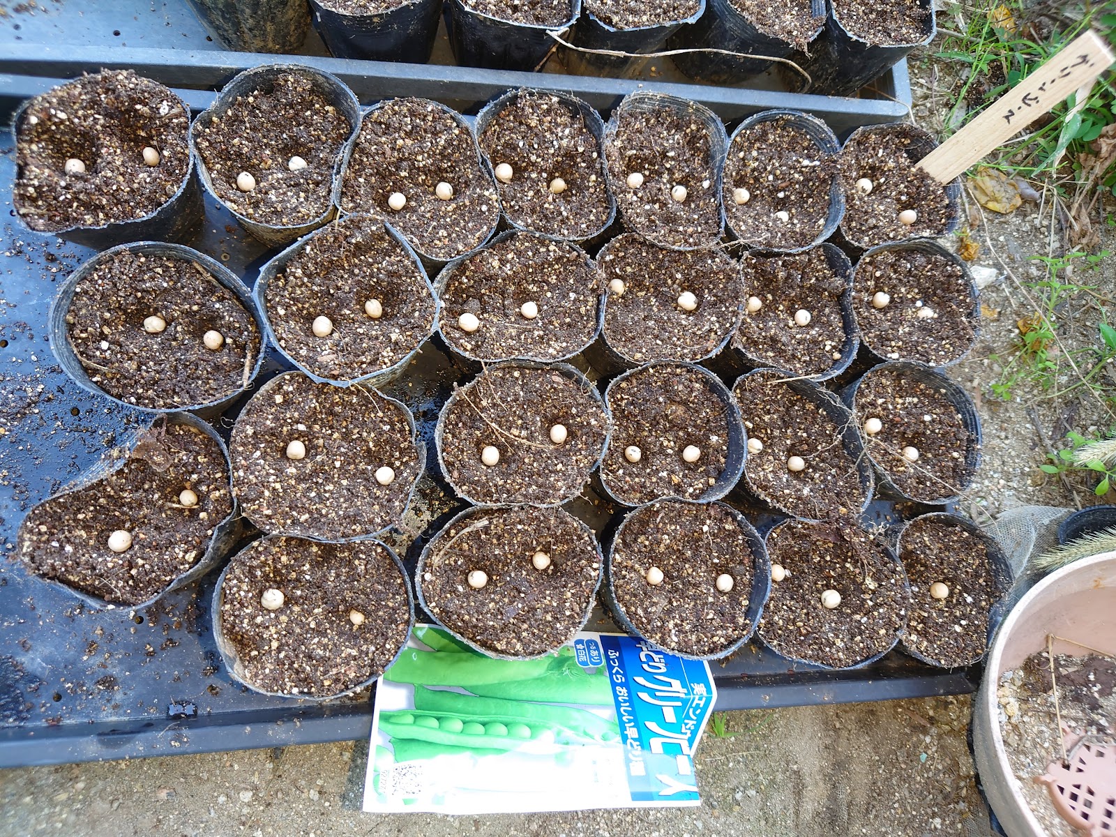 | 上の段からスナップエンドウ、グリーンピース、そして絹さや。 手前の絹さやは白花と赤花2種類の種を蒔いた。 |