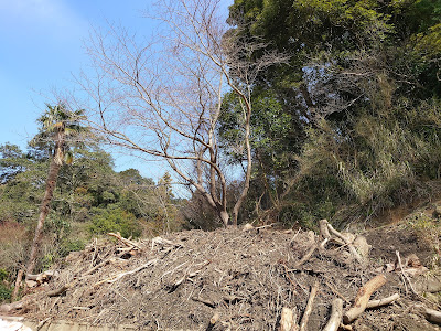 ところで、先週末から始めた新天地の一部に積み上げられた土砂や木の瓦礫の片付け、今日も少しやっておいた。