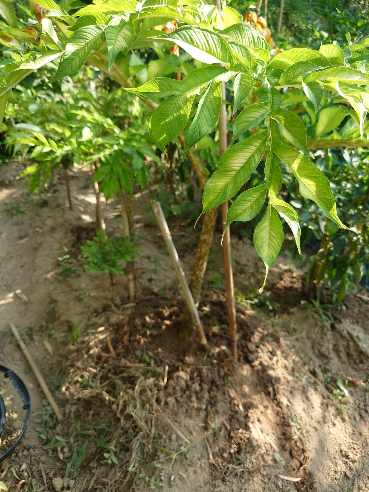 ここでは2本の苗が枯れたが、他はまだ健在。 この写真の苗からは料理に使えるコンニャクが収穫できるのではと期待している。 |
