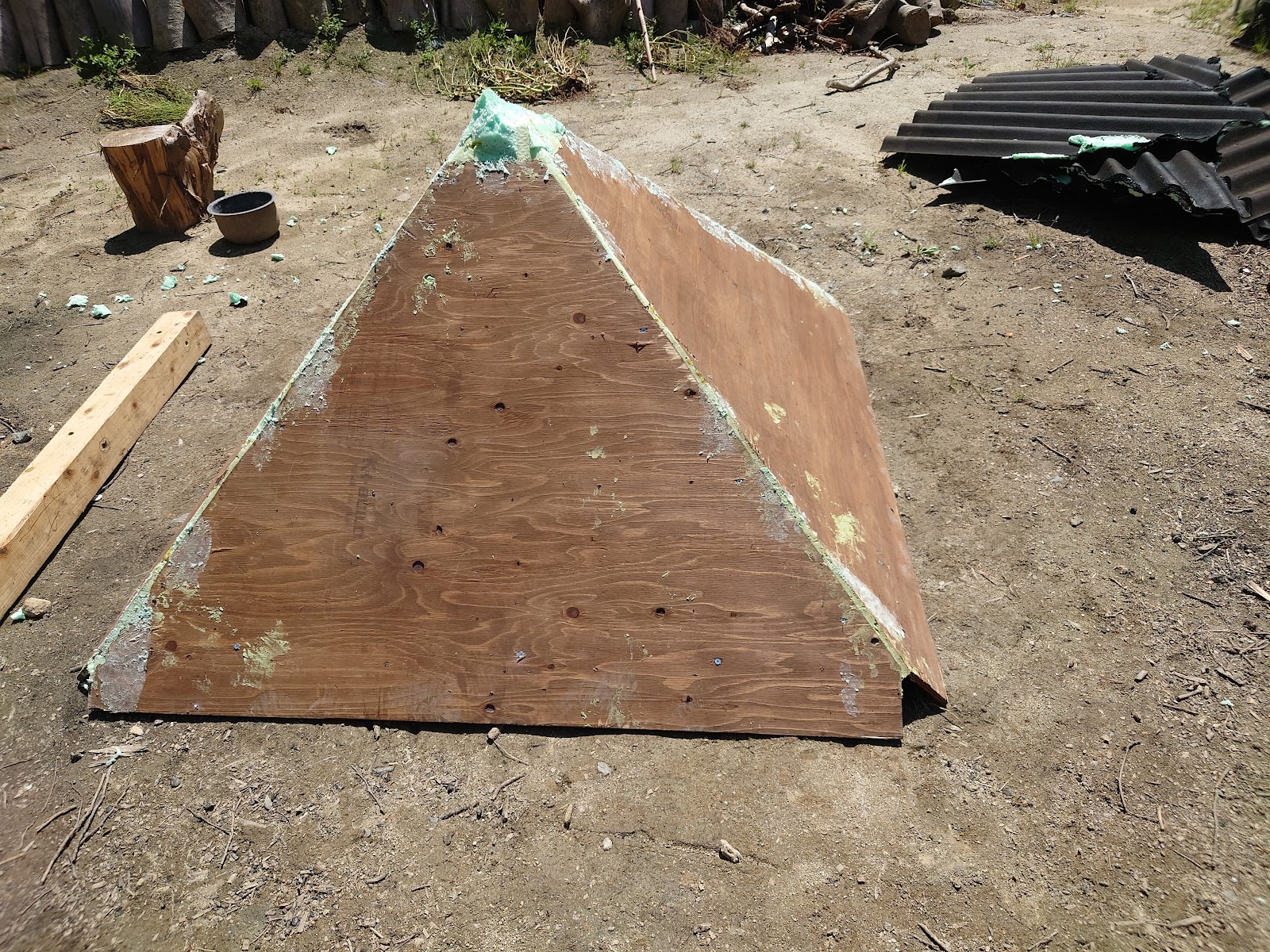 こちらは、屋根の四隅にガルバリウム鋼板を張り終えて、それらに黒いペンキを塗り終わったガゼボ。