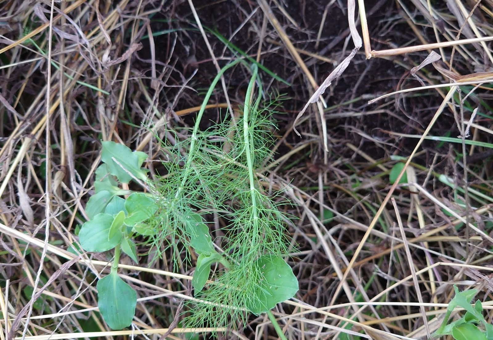 ところで昨年フェンネルを育てた畝は今は草ぼうぼう状態だが、そんな場所に小さな芽が出ていた。