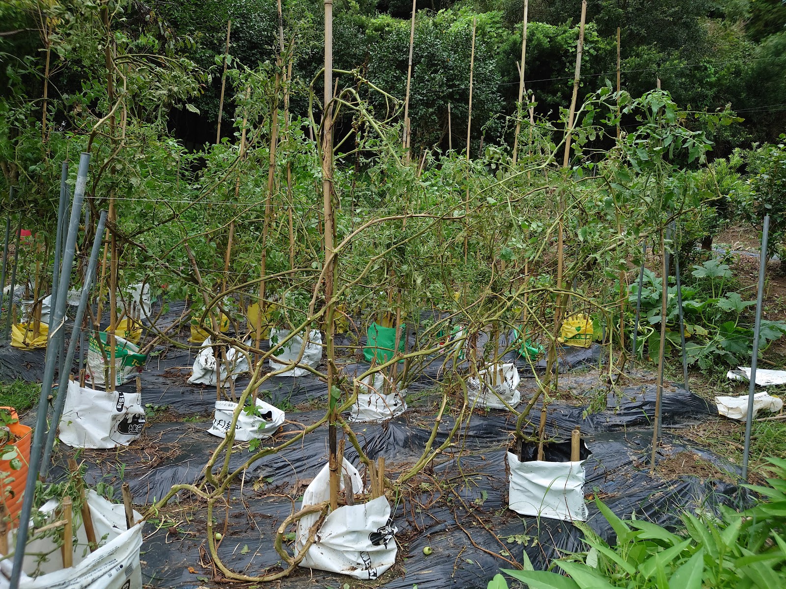 | こちらは土嚢袋で育てていたトマト。 たくさん収穫できたトマトの苗も時期的に弱ってくるのは仕方ないだろう。 |